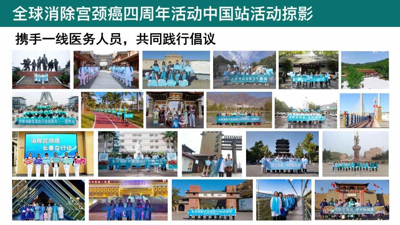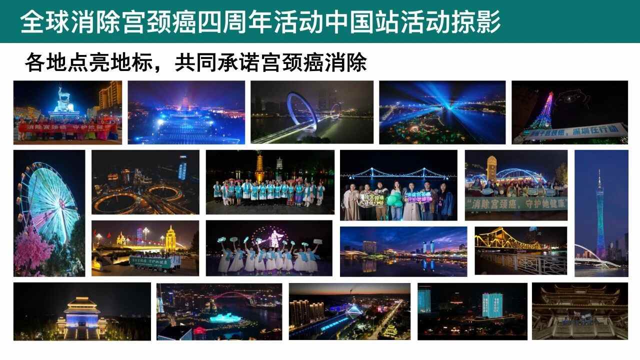 今年,世界卫生组织将全球消除子宫颈癌行动四周年的活动主题定为“助力一线医护:从全球共同承诺到拯救生命行动”,中国站的宣传标语“消除宫颈癌,守护她健康”亦随之响起。活动中,中国各地用行动传递希望,用灯光点亮决心,体现了从承诺到实践的真实进展。